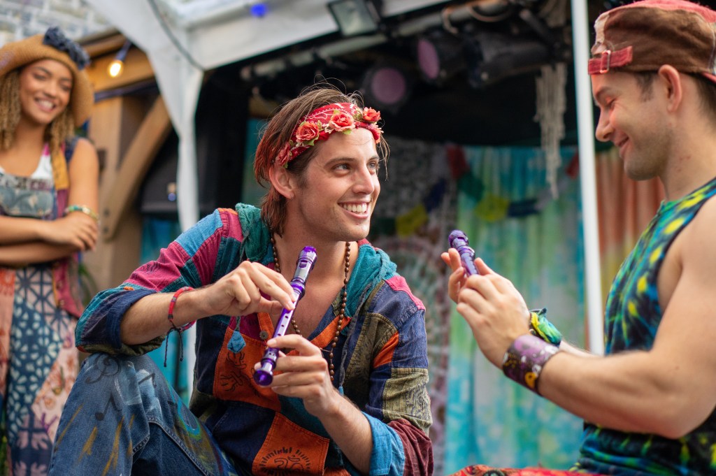 David Shields’ effective set is the Garden courtyard itself full of large plants, fairy lights, a few other strands of light bulbs that change primary colour, bright psychedelic wall hangings. It’s simple and effective, strips the show right back to its core with a cast of just six playing multiple roles (very well) and it’s memorable 70s-inspired songs ~ it could almost be a spin-off of HAIR the Musical.