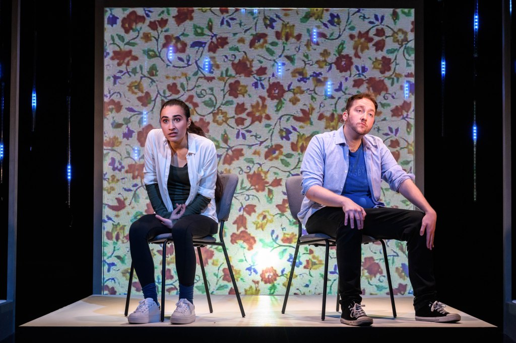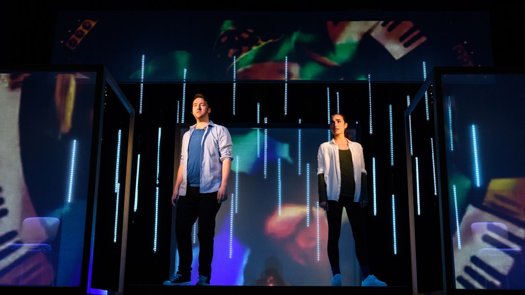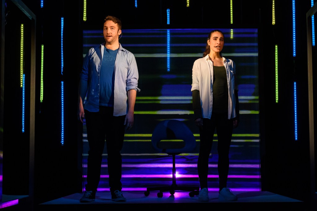 Kudos also to Matt Powell for his imaginative and brilliantly integratedvideo: Superb! The West End has seen video before but not like this. Together with Matt Daw and Sam Waddington’s mesmerising lighting, Chris Czornyj’s sound & system design, and Libby Todd’s inventive ‘visual internet’ set design, this is a dream creative team producing invigorating and exciting new Musical Theatre.