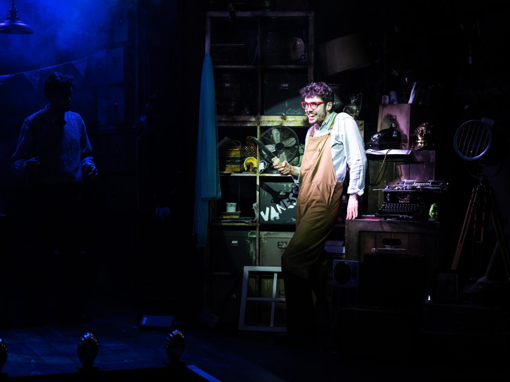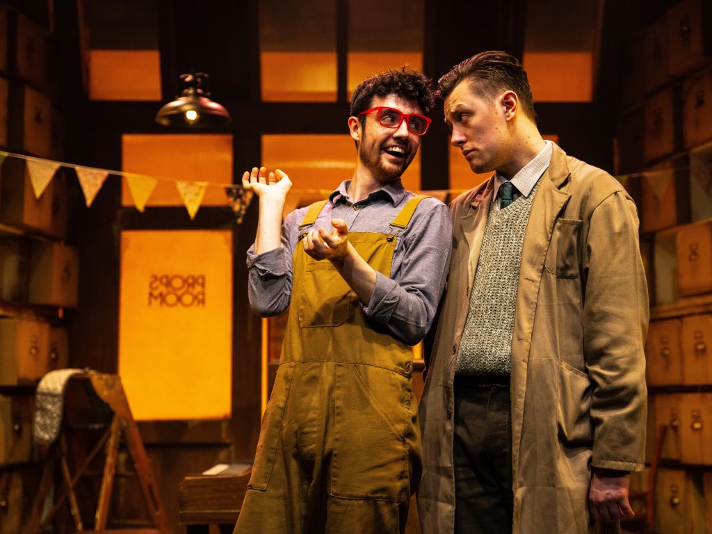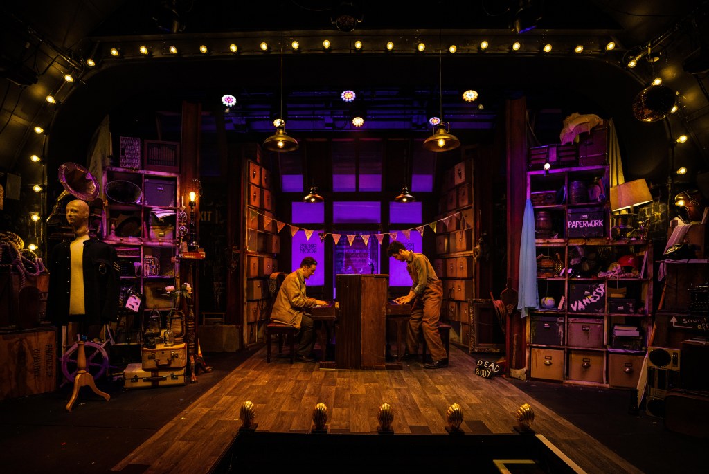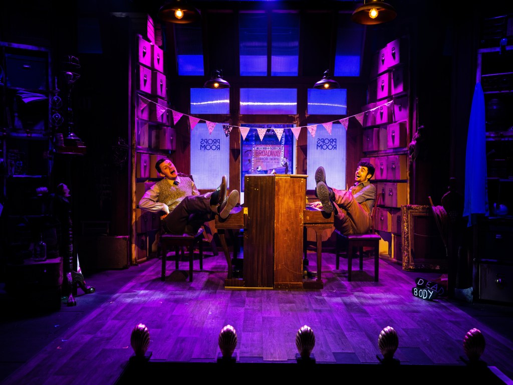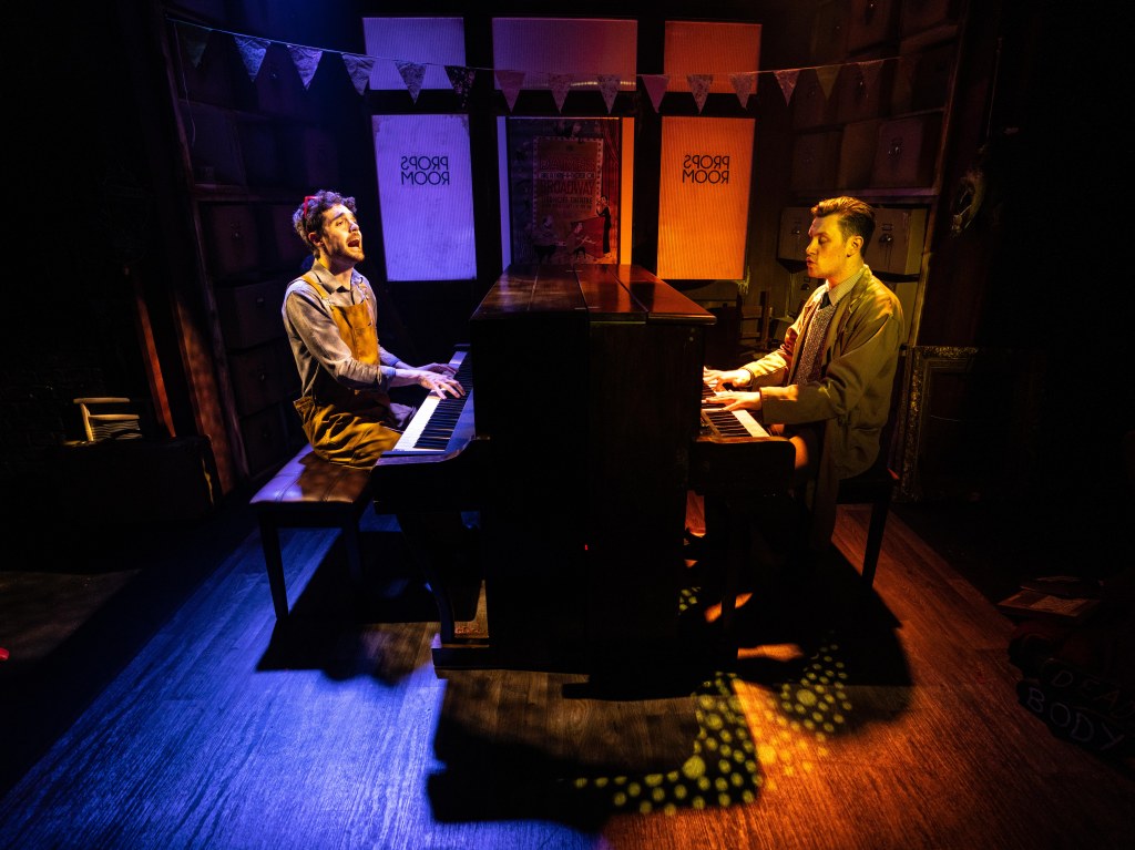 In his Director’s notes Hodgson says Murder For Two incorporates three of his favourite things: murder, mysteries, musicals, and imaginative storytelling. It is clear this production is a labour of love and care from performers and creatives together. Hodgson has set the piece in a prop store of a film studio which “incorporates an energy of magical theatrical history, as well as an energy of ‘anything can happen’…” Hodgson’s superb direction certainly succeeds in carrying the audience along this madcap journey!
