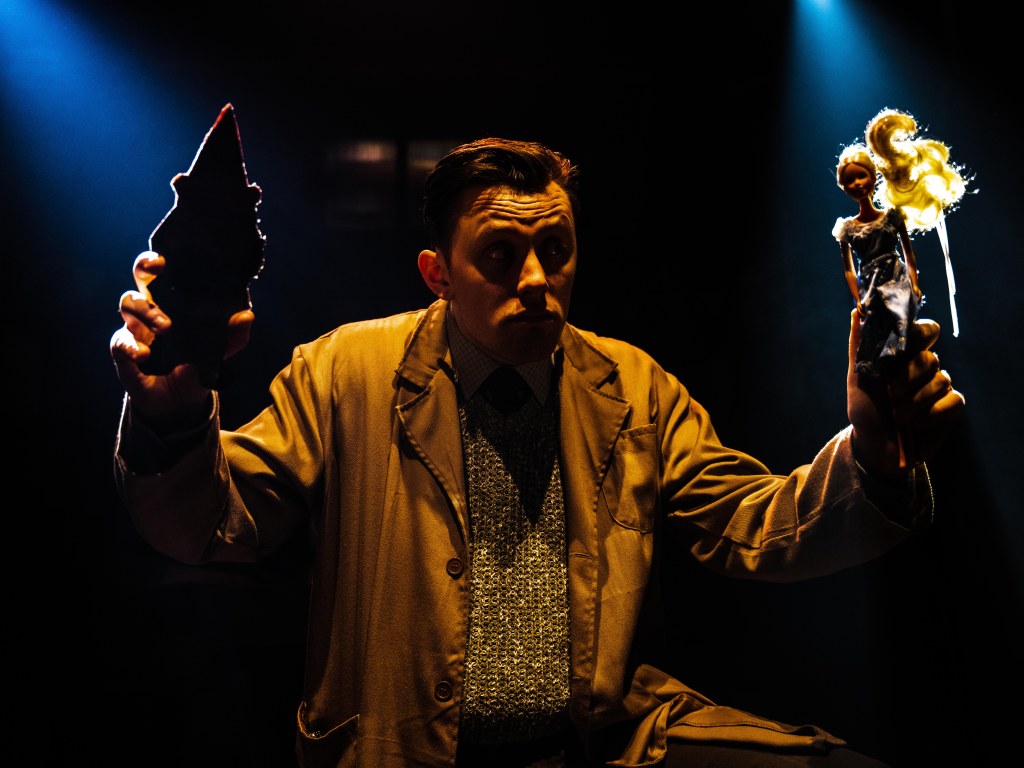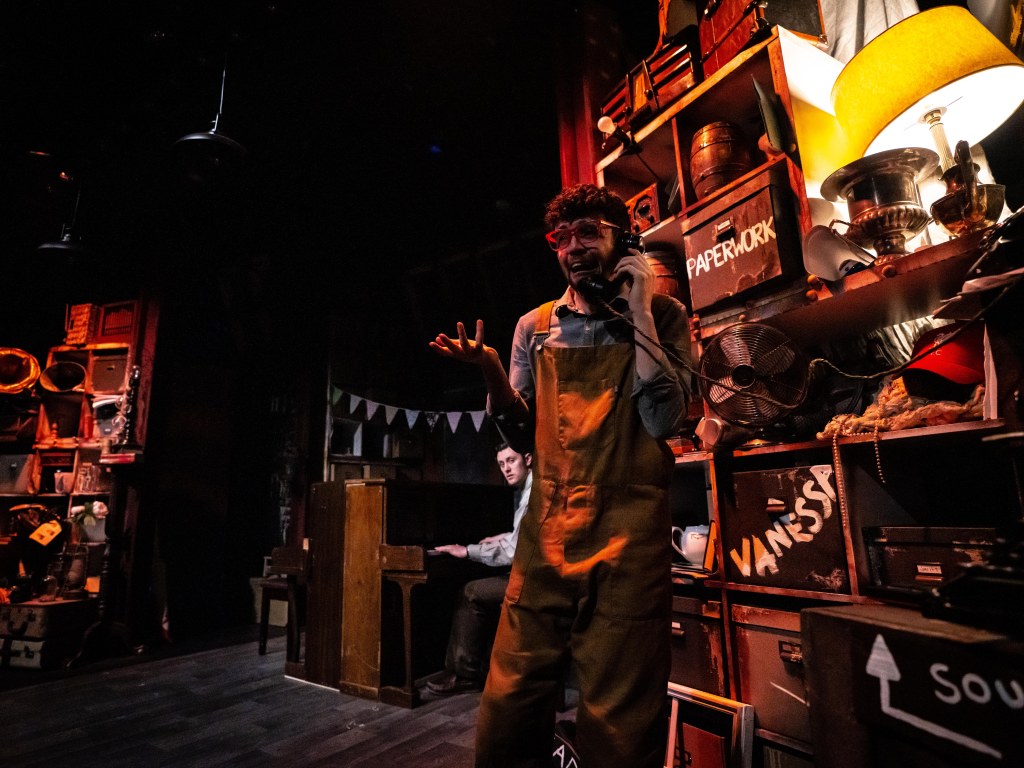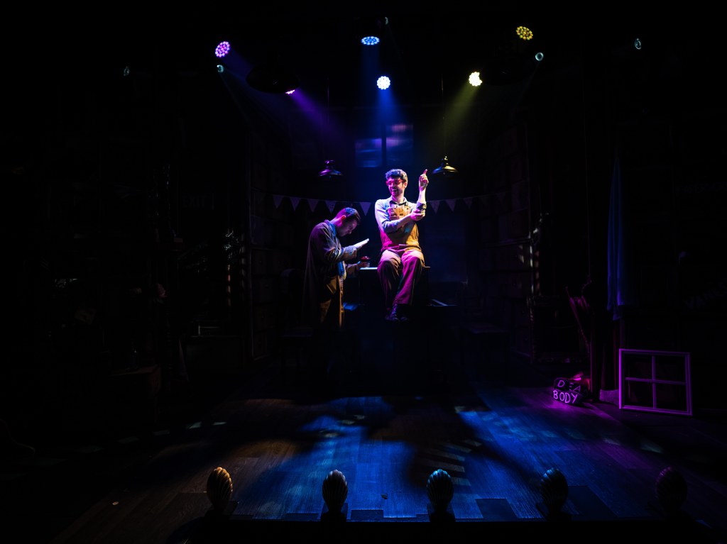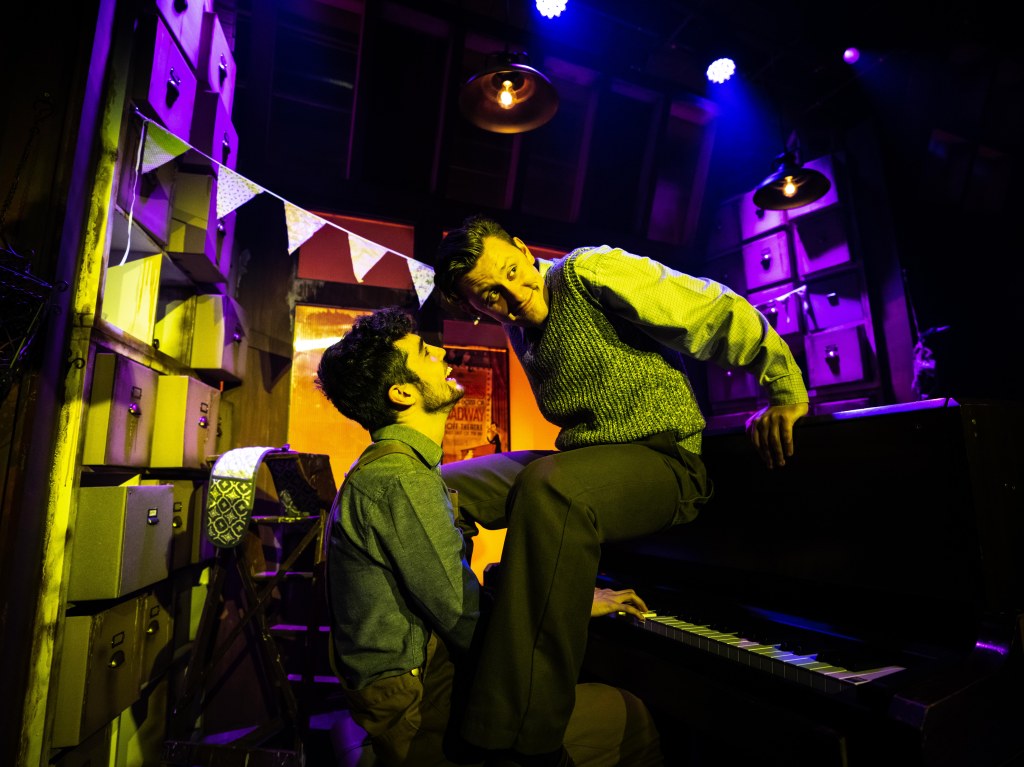 In his Director’s notes Hodgson says Murder For Two incorporates three of his favourite things: murder, mysteries, musicals, and imaginative storytelling. It is clear this production is a labour of love and care from performers and creatives together. Hodgson has set the piece in a prop store of a film studio which “incorporates an energy of magical theatrical history, as well as an energy of ‘anything can happen’…” Hodgson’s superb direction certainly succeeds in carrying the audience along this madcap journey!