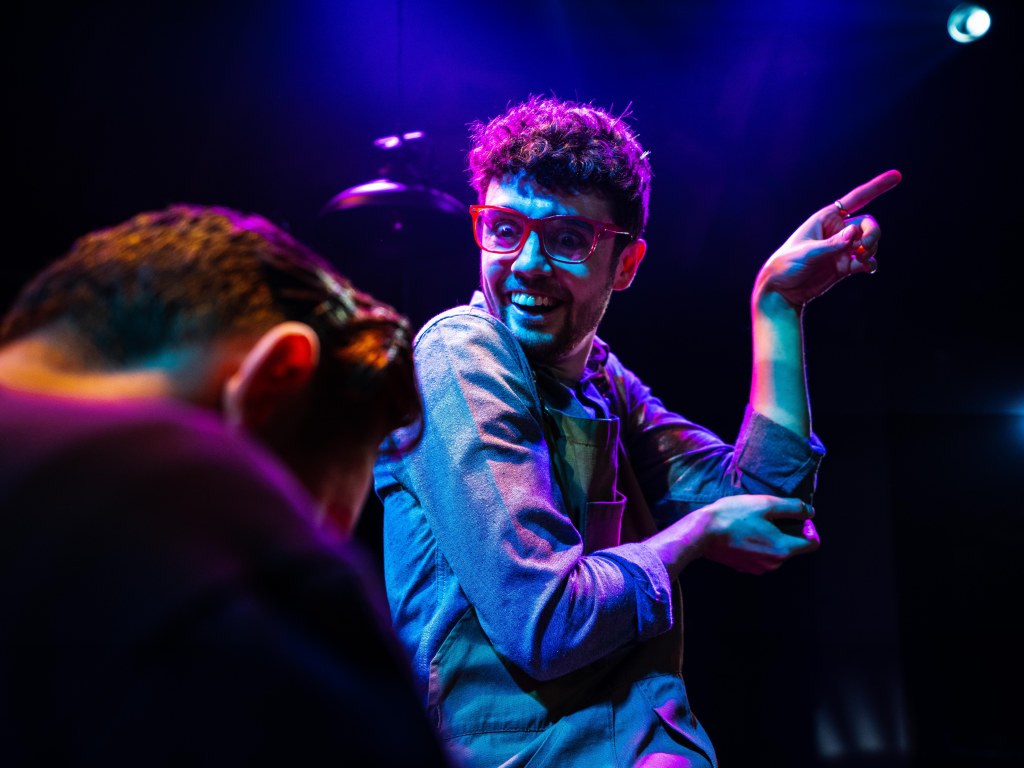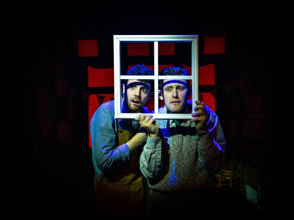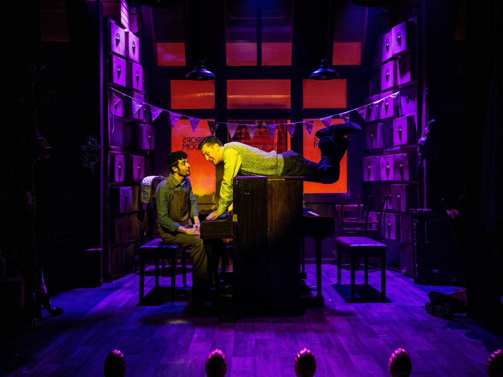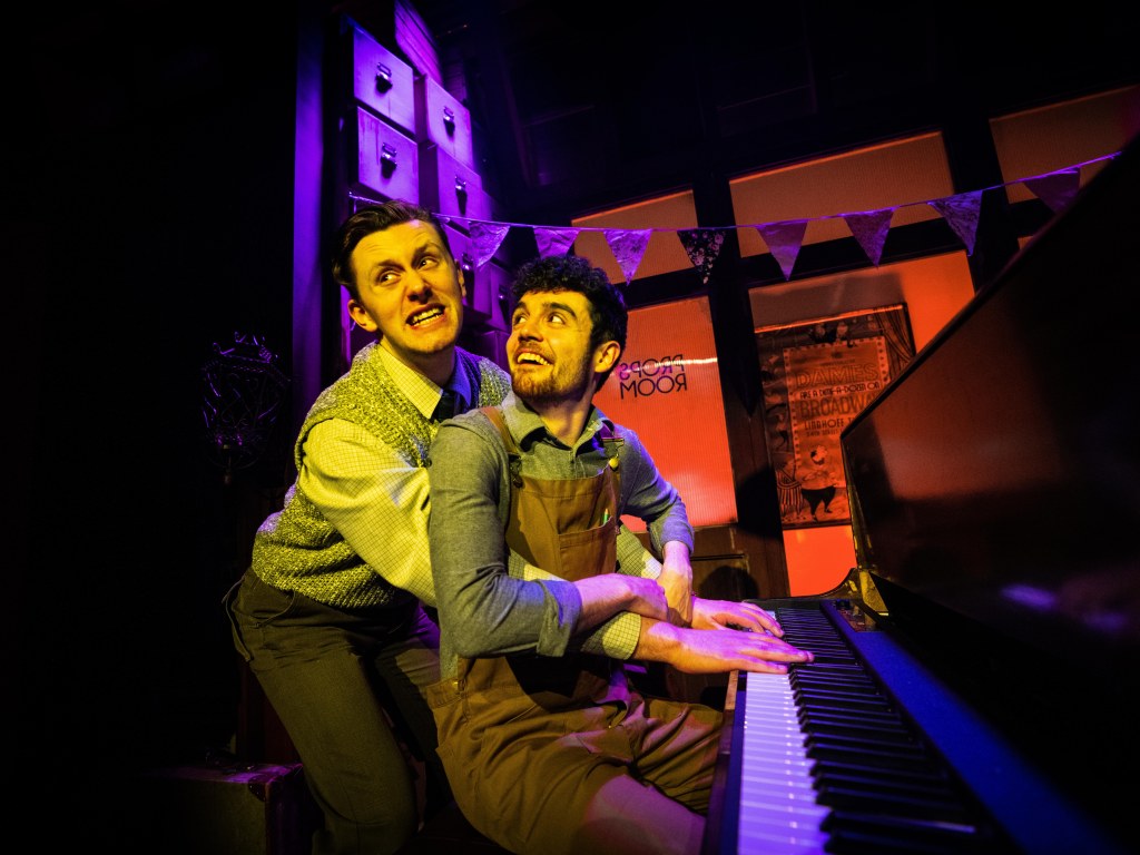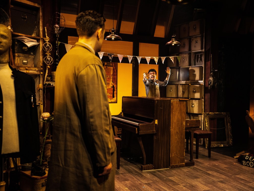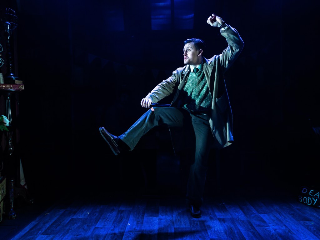 A wonderful homage to the murder mystery genre and classical musical slapstick comedy, Murder For Two is a witty, often hilarious blend of music and mayhem. When famous novelist Arthur Whitney is found dead at his birthday party, a detective is required to solve the crime but alas none are available. Enter Neighbourhood Officer Marcus Moscowicz, played by Lee O’Reilly (who impressively makes his professional debut in this role having graduated in 2020 during the pandemic)who seizes his opportunity to prove his worth and solve the crime before the real detective arrives. He takes the audience with him on his super sleuthing journey, seizing every object as a possible clue, his confidence dashed when it leads to a ‘dead end ‘. We the audience are drawn in and willing him to succeed before the ‘real’ detective arrives. The connection is real!