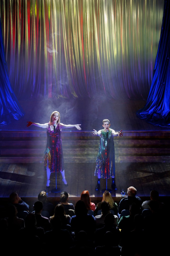 With a nine piece band led by Daniel Schlosberg on piano, set design of drapes and more drapes cleverly effective by Carlos Soto, lighting by John Torres, and sound by Lucy Baker and Ed Lewis that perfectly balances the two very different vocal styles.